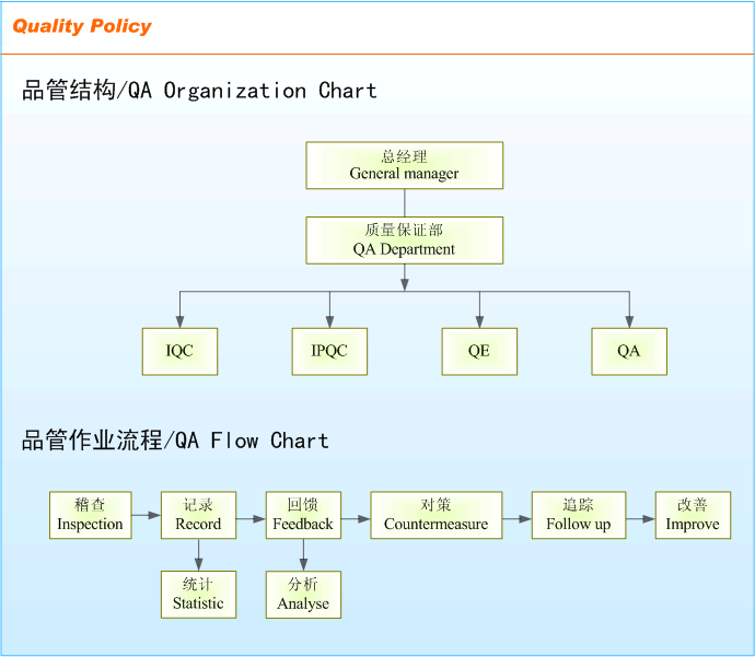 公司导入SGS ISO9001:2008质量体系。在欧盟RoHS指令2005/95/EC 关于在电子电气设备中限制使用某些有害物质指令及欧盟WEEE指令2006/96/EC 废弃电子电气设备指令颁布后,我们迅速引导管理和技术,使整个生产操作流程都按照这双指令的标准执行。我们还将准备努力通过EMS来维持制造及所有活动中的预防和污染,从而削减危害物质达成目标。我们的生产过程已完全实现无铅化,并在这制程中建立有类似QC08000过程管理体系,加以控制。